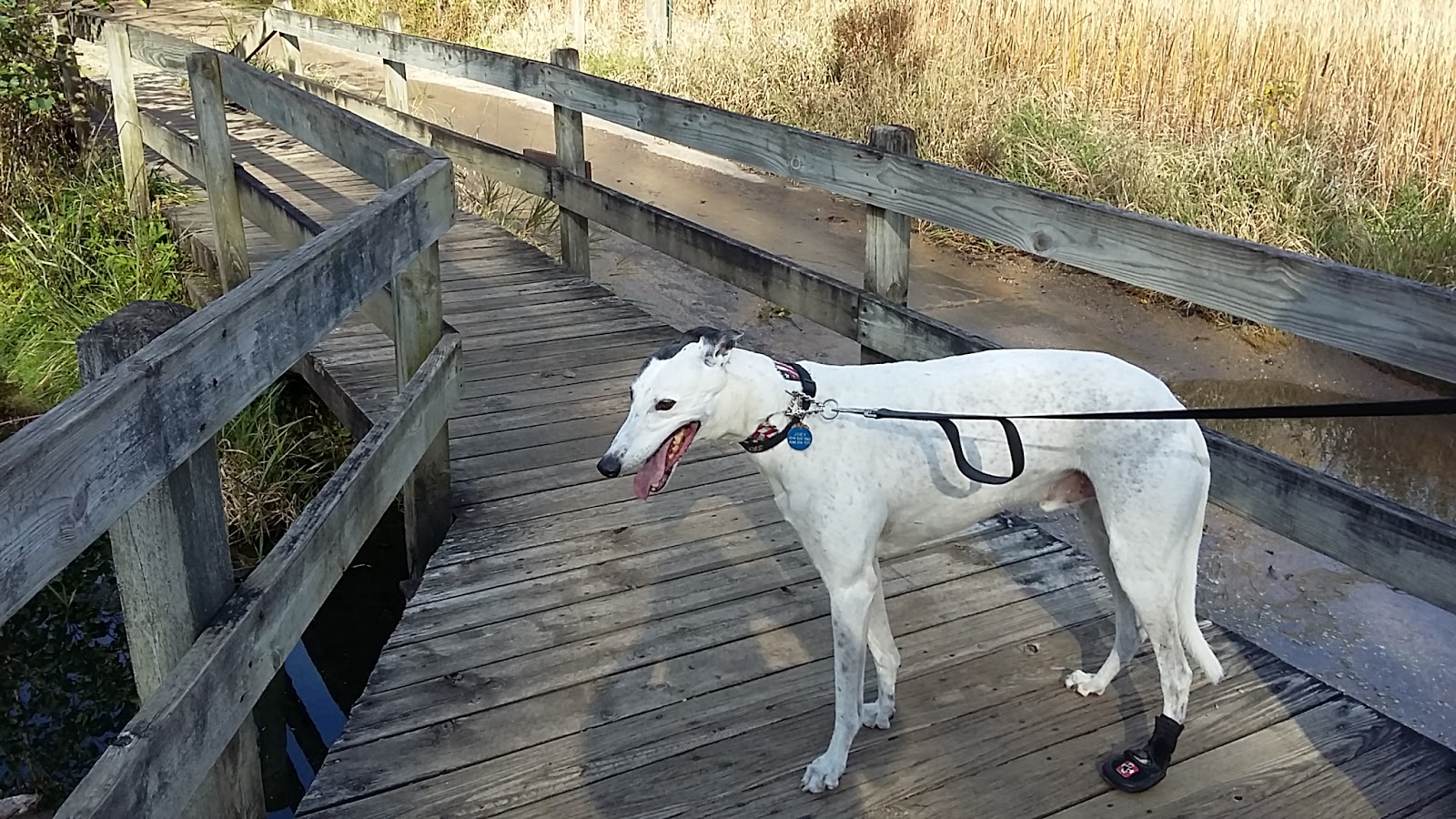 We walked almost two miles. The trail was easy. We met a family from England. She saw my booted foot and said "Oh, does he have corns?" We were quite surprised that she guessed it. Yep, she has greyhounds. She said her last one had corns.